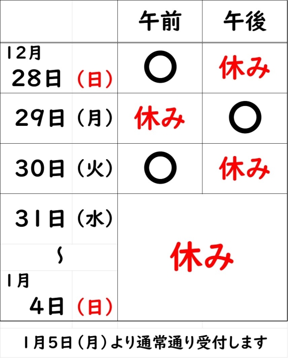 受付時間 月曜日~金曜日 午前8時30分~12時00分 午後3時30分~7時30分木曜日・土曜日 午前8時30分~12時00分 午後 休み休み 日曜日・祝日・木曜日午後 土曜日午後TEL 0577-34-3956 受付時間 月 火 水 木 金 土 日 8:30~12:00 〇 〇 〇 〇 〇 〇 ー 15:30~19:30 〇 〇 〇 ー 〇 ― ー